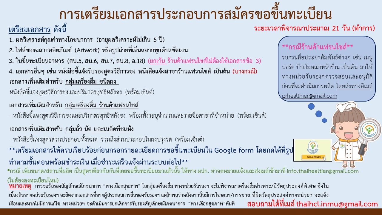 - กรณี เพิ่มขนาด/สถานที่ผลิต เป็นสูตรเดียวกันกับที่เคยขอขึ้นทะเบียนมาเเล้วนั้น ให้ทาง ผปก. ทำจดหมายเเจ้งเเละส่งเมล์เข้ามาที่ info.thaihealtier@gmail.com (ไม่ต้องลงทะเบียนใหม่)